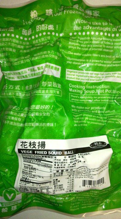 VegeFarm Fried Squid Ball Weight:16 oz Ingredients: Soy Protein NON-GMO(Contains Soy, Wheat), Whey Protein(Milk Product), Canola Oil, Starch, Yuba, Salt, Sugar, Brew Soy Sauce(Contains Sugar, Salt, Soy, Wheat), Vegetarian Seasoning.